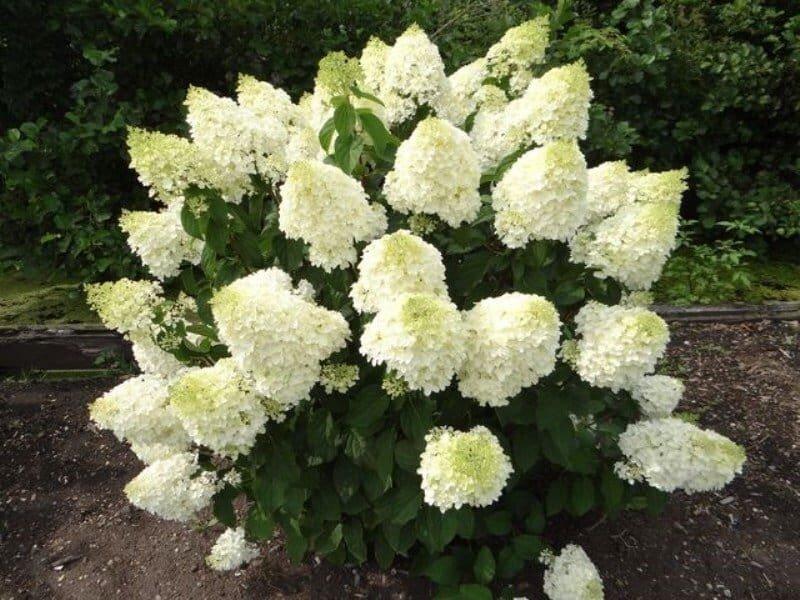 Молодые побеги гортензии паникулата имеют зеленый цвет и прямостоячую форму. С течением времени стебли становятся коричневыми. Листья растения темно-зеленые и слегка заостренные. Плотные округлые соцветия изначально имеют бледно-зеленый оттенок, затем, по мере роста куста, они становятся белыми, а к завершению цветения приобретают розоватый тон.