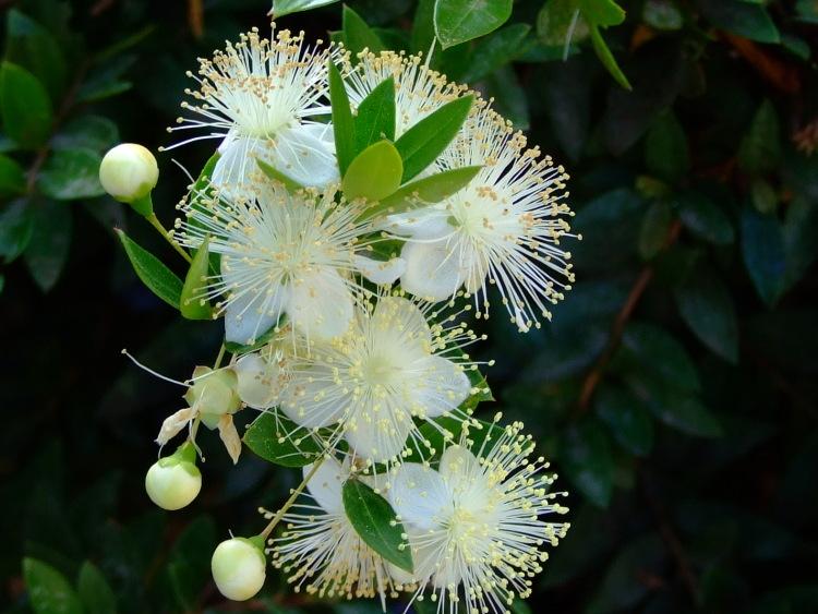 При создании оптимальных условий мирт начинает цвести мелкими цветками, которые могут быть бежевыми или белоснежными с золотистыми тычинками. Его часто используют для создания цветочных композиций.