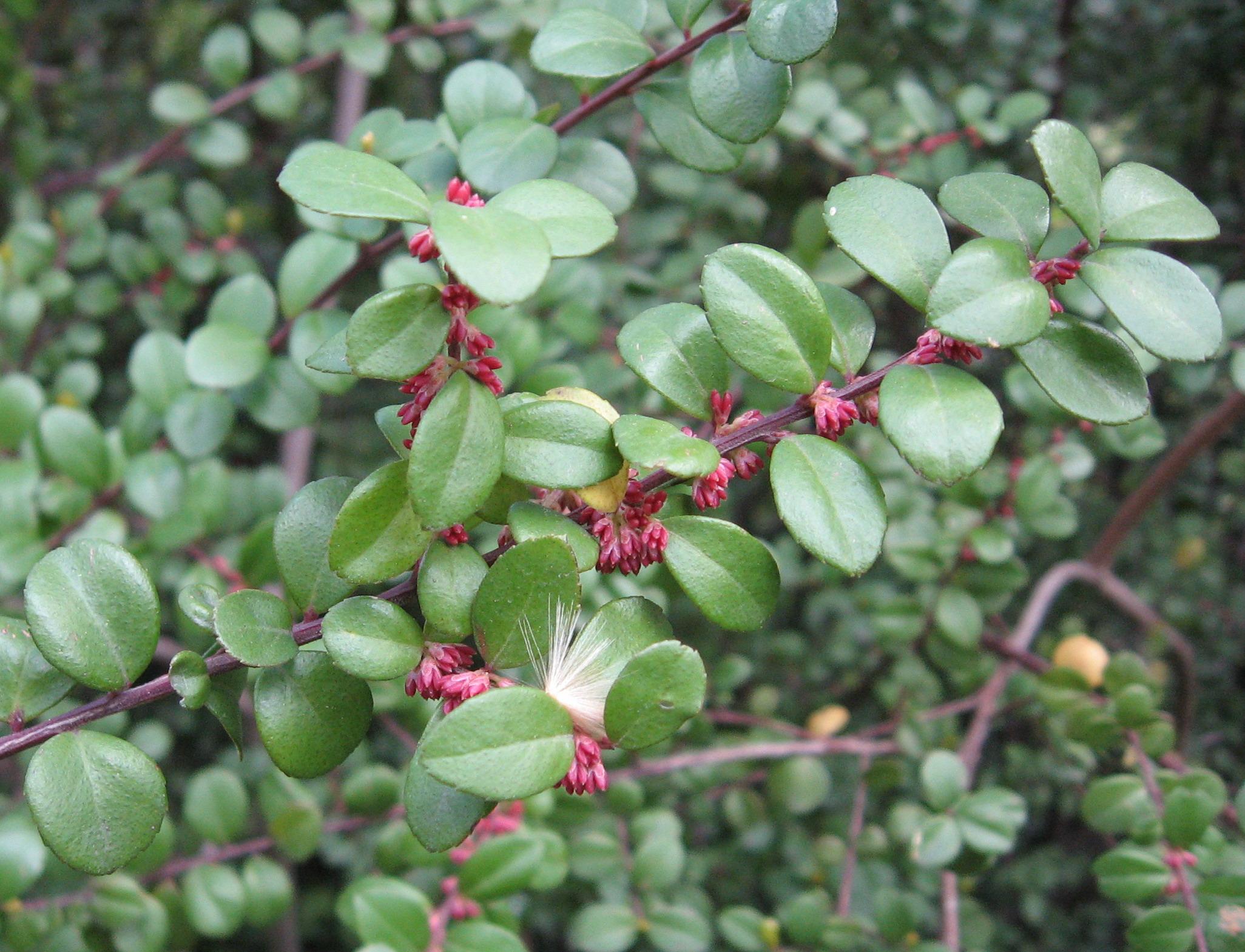 Побеги имеют красноватый оттенок. Листья небольшие, эллиптической формы: сверху они темно-зеленые, а снизу – светло-зеленые.