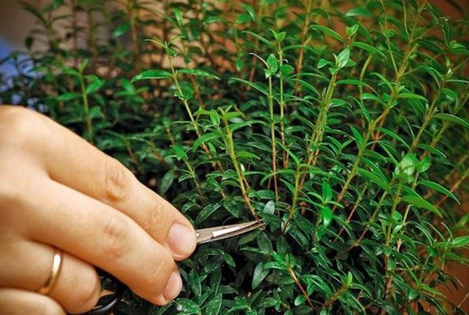 Обрезка менее травматична для растения, и ее лучше выполнять весной. С помощью обрезки боковых побегов можно формировать крону, а обрезка верхушечных побегов придаст мирту кустовидную форму.