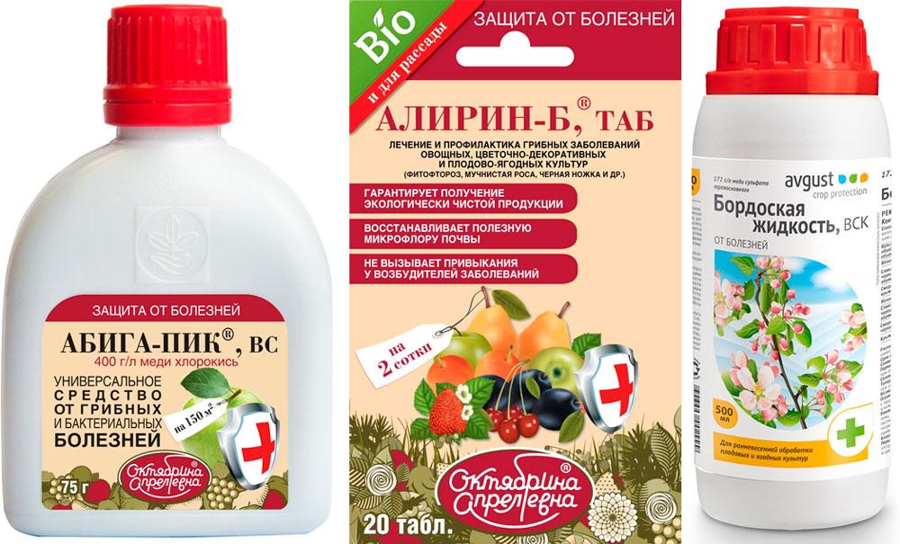 - «Алирин». Это биофунгицид, состав которого схож с «Фитоспорином». Его применяют в период максимального распространения грибковых заболеваний.
