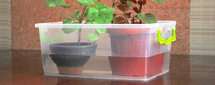 Простой и удобный способ. Он часто применяется для предотвращения избыточного увлажнения почвы. В качестве поддона можно использовать большую миску или таз. Важно, чтобы между верхней частью горшка с геранью и стенками поддона оставалось не менее 5 см.