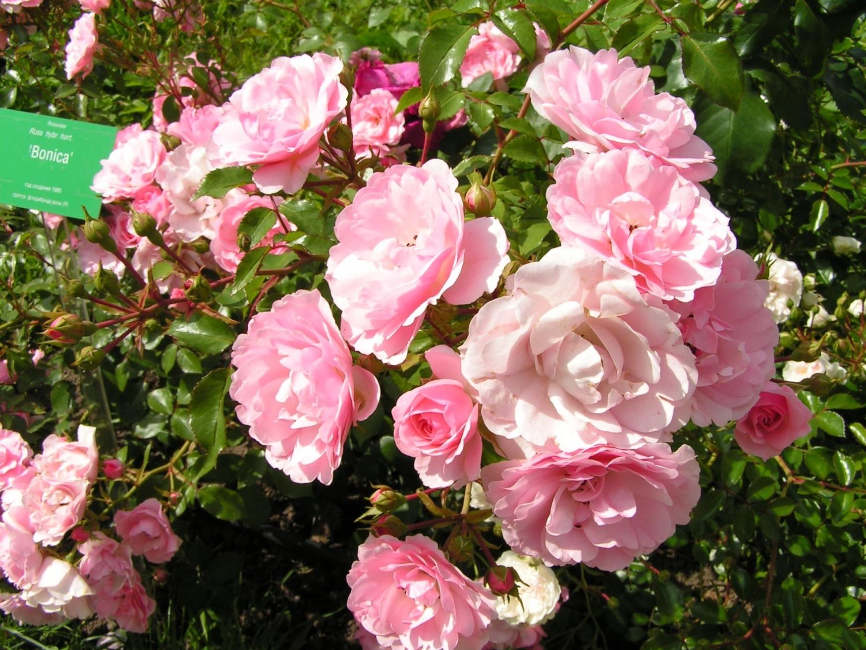 | Роза флорибунда «Боника 82» (Bonica 82) | Одна из самых популярных роз флорибунда. Цветки мелкие, махровые, нежно-розовые, собраны в крупные соцветия. | Цветет чрезвычайно обильно и непрерывно в течение всего сезона, до самых морозов. |