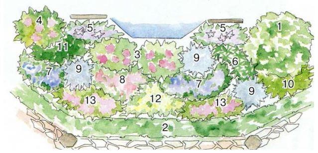 Далее осуществляется группировка растений. Под номерами 5, 6, 7, 8 и 9 высаживаются гибридные, пышные, клинолистые, метельчатые и мускусные камнеломки. Гвоздика перистая (10) добавит кустарникам нежные оттенки и неповторимый аромат. Каменная роза (11) станет ярким акцентом клумбы, а барбарис Тунберга (2) создаст изящный бордюр.