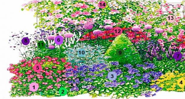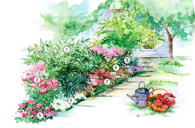 Основой миксбордера станет изящный жасмин (1). С обеих сторон разместятся пионы (2) и флоксы (3). Средний ярус среднерослых растений будут составлять лилии (4) и агератум Хоустона (5). Для формирования бордюра среди низкорослых растений подойдут лобулярия морская (7) и турецкая гвоздика (8).