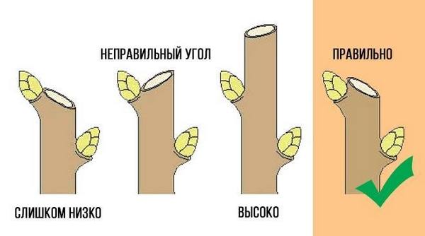 - Срезы на взрослых побегах следует делать под углом, оптимальный угол — 45 градусов.