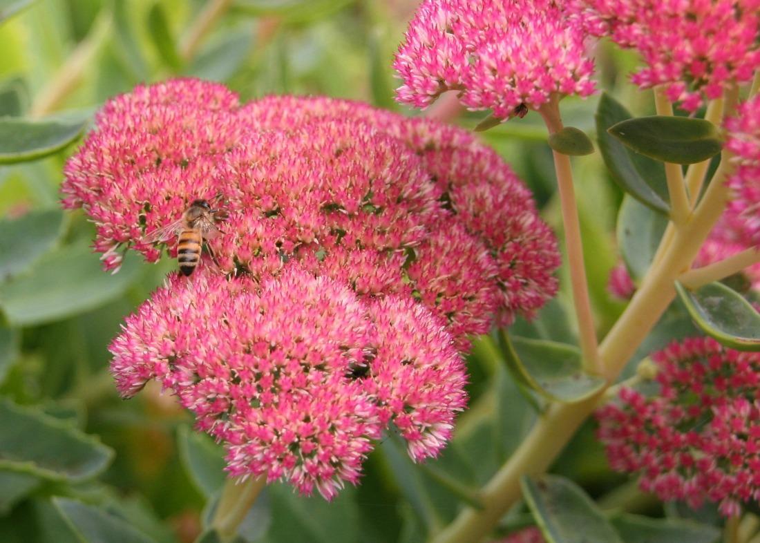 Небольшие цветки в форме звездочек (желтые, голубые, розовые, белые) собраны в соцветия-шапки, что придает растению привлекательный и нарядный вид. Цветение продолжается до поздней осени, когда садовые краски тускнеют, и только очиток выделяется ярким акцентом на фоне увядающих растений.