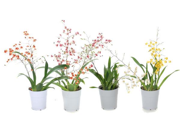 Разнообразие видов: Онцидиум — это род орхидей, который включает более 200 видов и множество гибридов. Каждый вид имеет свои уникальные цветовые вариации и формы цветков, что делает онцидиум одним из самых разнообразных родов орхидей. Цветы могут быть желтыми, коричневыми, белыми и даже пурпурными, часто с характерными пятнами и полосами.