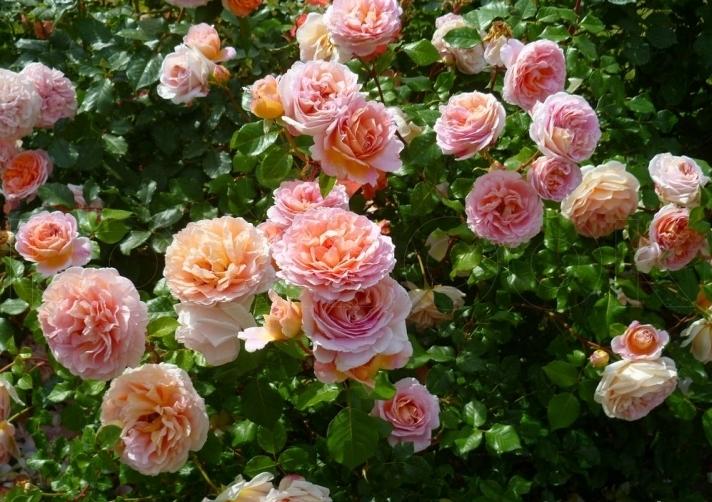 - Abraham Darby. Кустарники этого сорта характеризуются быстрым ростом и стойкостью к болезням. Они цветут дважды за сезон крупными цветками теплого оранжевого оттенка с розовыми кончиками.