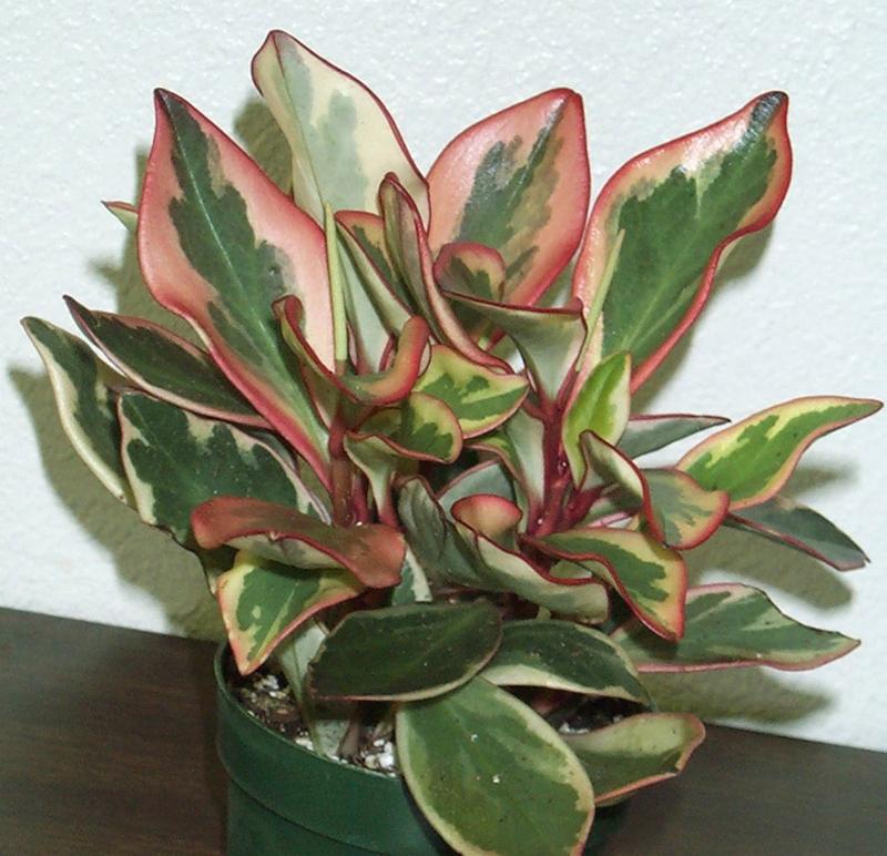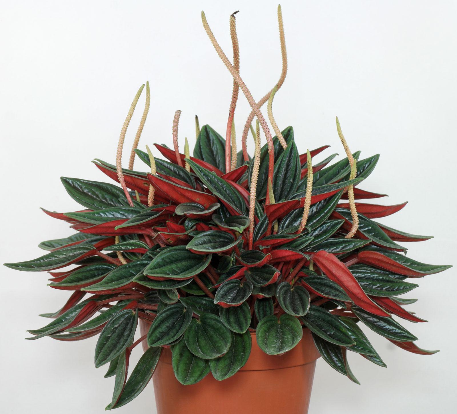 Яркий и привлекательный многокистевой суккулент с эффектными листьями. Верхняя сторона листьев имеет светло-зеленый оттенок, а нижняя — рубиновый или бордовый. Листья растут, закручиваясь к центральному стеблю. Иногда у комнатного фикуса пеперомии появляются цветы, напоминающие кораллы.