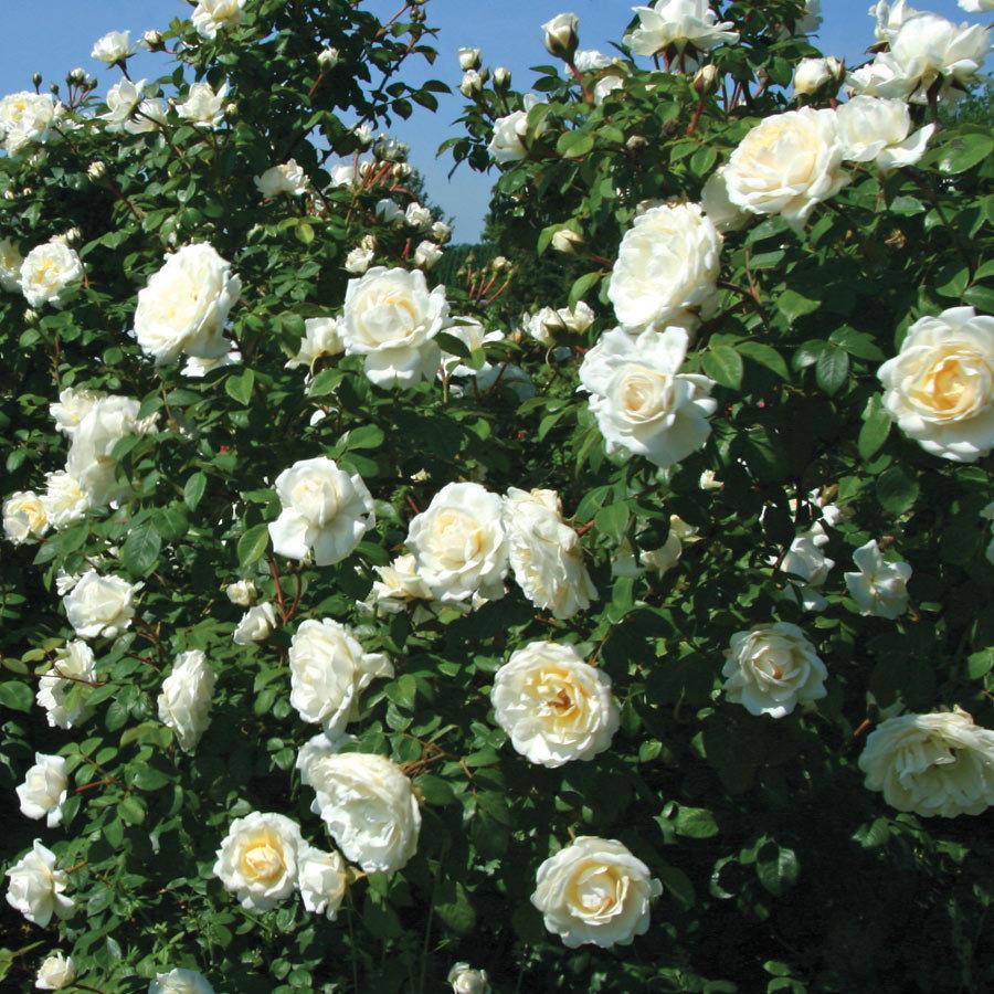 Удивительный сорт с чашевидными цветами белоснежного оттенка, слегка кремового тона. Это растение представляет собой среднерослый кустарник, достигающий высоты до 1,5 метра. С приходом теплых дней на каждом вертикальном побеге распускаются три небольших бутона диаметром примерно 10 см.
