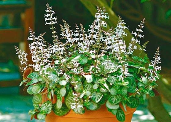 Плектрантус вариегатный – разновидность комнатной мяты с серо-зелеными листьями, края которых окрашены в светлые тона. Во время цветения на кустах появляются мелкие белые цветы. Вариаегатный сорт прекрасно смотрится в сочетании с пеларгонией, сурфинией, бородатым шпороцветником (barbatus) и мятой golden.