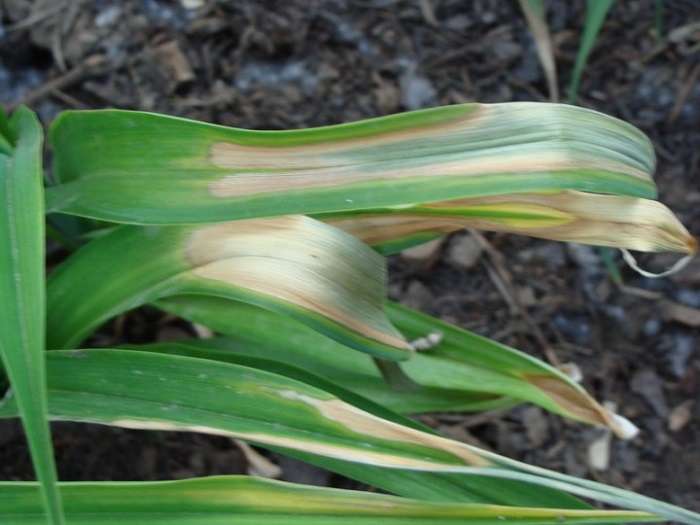 Грибковые инфекции, как правило, поражают зеленую часть растения. Листья начинают желтеть с кончиков, и со временем этот процесс охватывает всю поверхность листа. Иногда на листве появляются желто-коричневые пятна или полосы. Единственным решением в этом случае является удаление всей пораженной листвы.