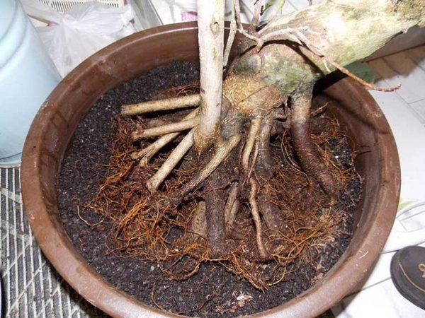 Патологическое состояние развивается из-за постоянного увлажнения почвы и активного размножения грибковых инфекций. Эти микроорганизмы поражают корневую систему, постепенно затрагивая всё растение. Корни становятся коричневыми, теряют упругость и начинают гнить. В результате дерево не получает необходимых питательных веществ и начинает увядать.