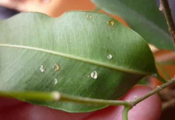 Первоначальные признаки заболевания проявляются в виде влажных пятен, которые быстро увеличиваются в размере. Со временем они сливаются, образуя обширные участки с желтоватыми краями, расположенными по краям листьев. В тяжелых случаях заболевания дерево может начать сбрасывать листья даже в период активного роста, и его лечение становится затруднительным.