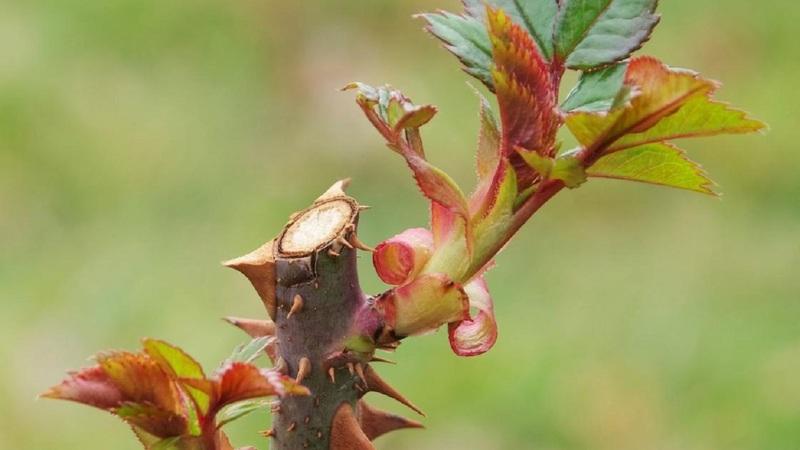 - Молодые побеги роз имеют темно-красный цвет, тогда как у шиповника они зеленые.