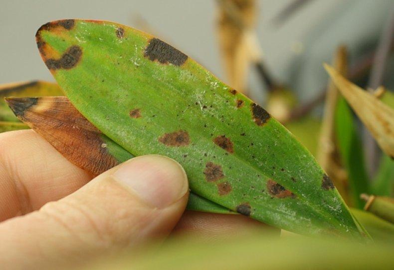 Коричневые пятна на краях листьев называют некрозом. Это заболевание связано с частичным отмиранием тканей. Оно возникает из-за гибели части корней, что мешает цветку получать необходимые для роста питательные вещества.