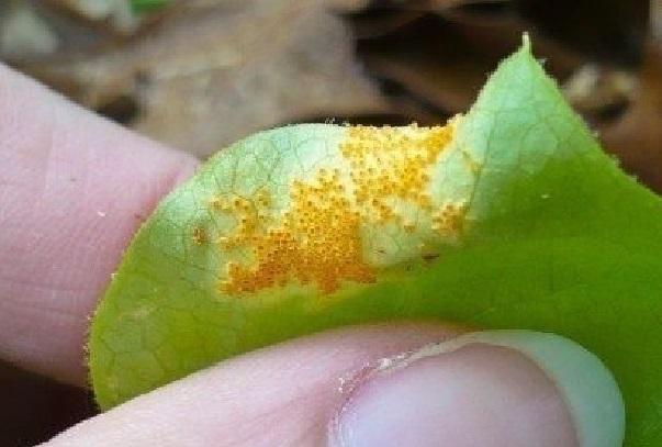 - Ржавчина сначала проявляется на нижней стороне листа оранжево-коричневыми пятнами спор, а затем переходит на верхнюю поверхность. В результате листья фуксии начинают желтеть или коричневеть и опадают.