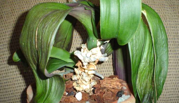 При извлечении орхидеи из горшка и внимательном осмотре корней можно обнаружить коричневые пятна, указывающие на гниение (в здоровом состоянии корни имеют светло-зеленый цвет). Также страдают нижние листья: сначала они становятся мягкими, а затем начинают отмирать.