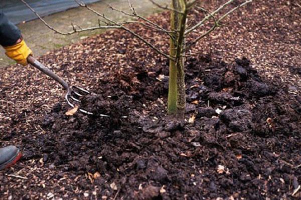 - Навоз смешивают с мульчей и используют эту смесь для покрытия приствольного круга растения.