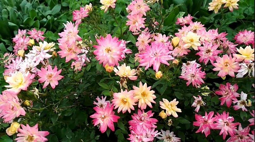 Перед вами низкие кусты, густо усеянные бутонами – значит, перед вами полиантовые (бордюрные) розы. Невысокие кустики непрерывно цветут всё лето. Розочки могут быть как простыми, так и махровыми. Полиантовые розы отличаются тем, что практически не имеют шипов.