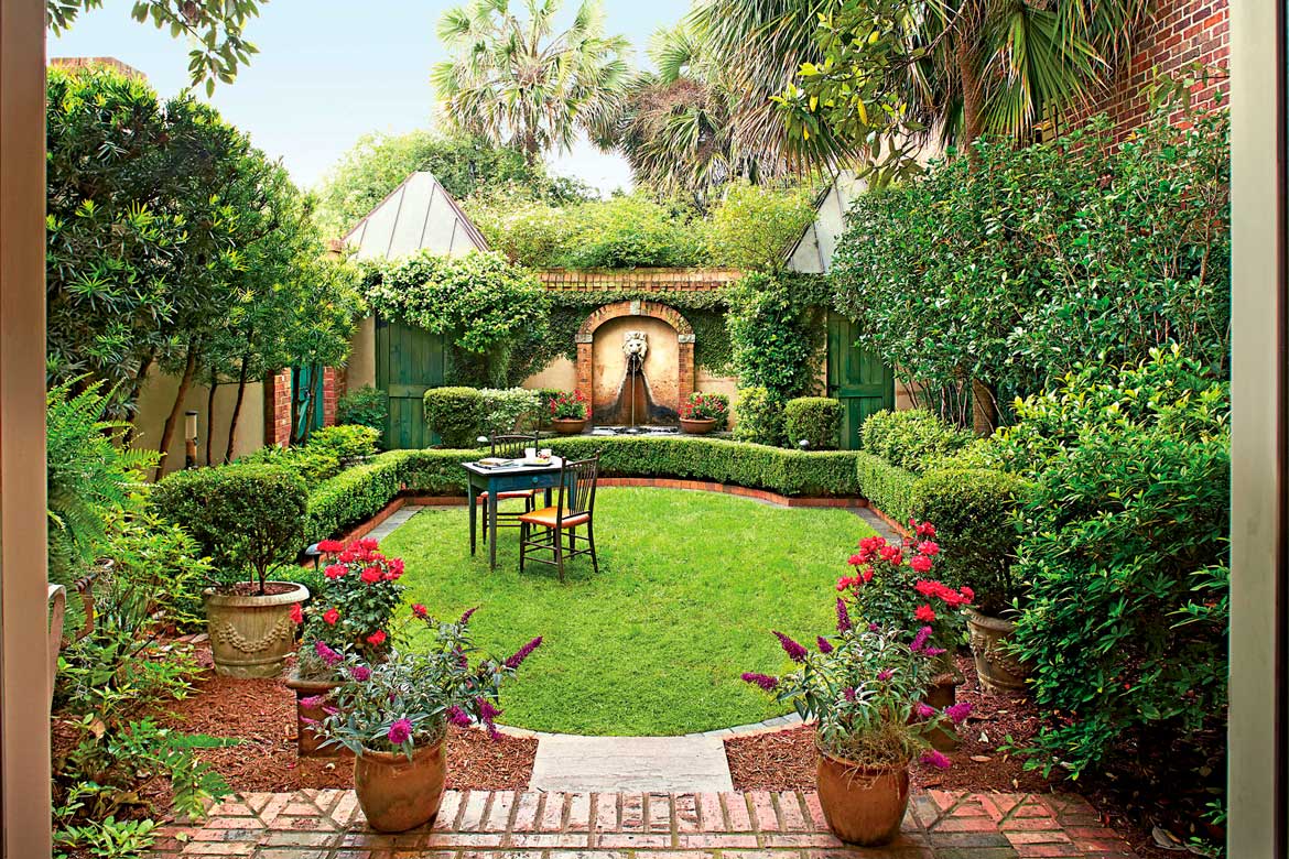 Противоположной прямоугольной форме является круглая планировка участка. В этом случае основными элементами становятся клумбы и газоны, а также уютные патио. Прямые линии и углы рекомендуется скрывать за вьющимися растениями.
