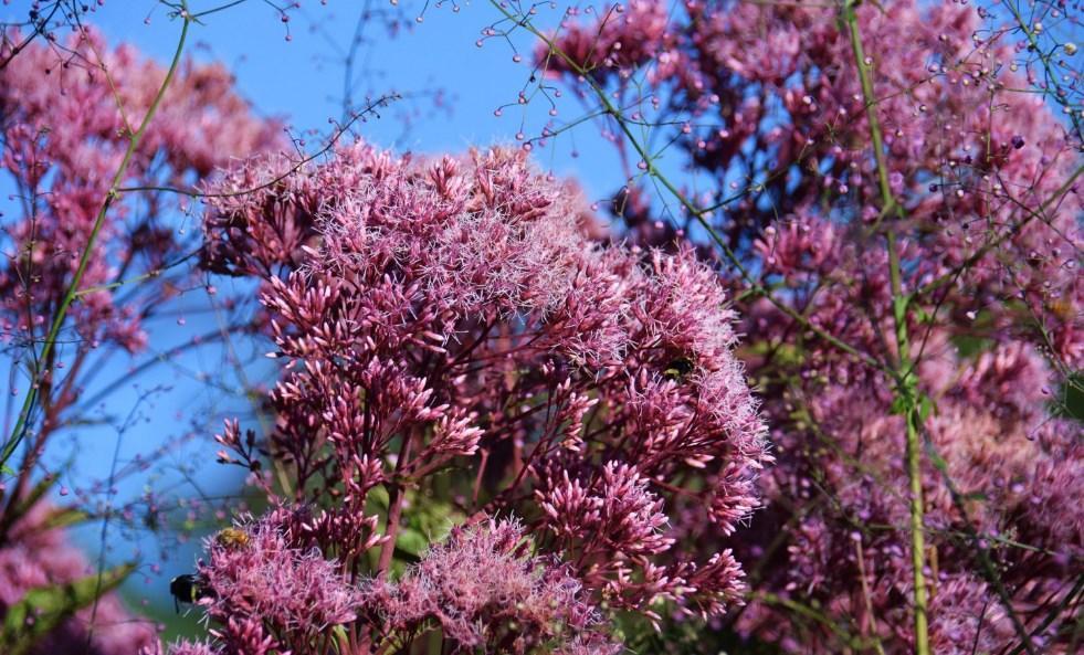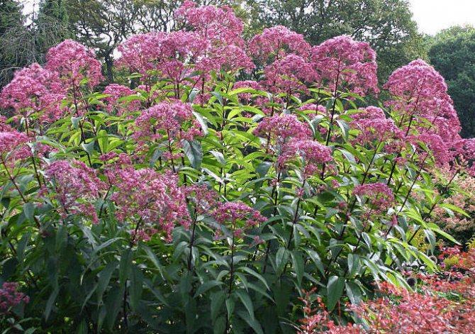 Цветы посконника могут варьироваться по оттенкам: они бывают как розовыми, так и фиолетовыми. У этого растения крепкие, прямые стебли, которые могут вырастать до 2,5 метров в высоту. Листья кустарника имеют ярко-зеленый цвет, крупные и вытянутые. Небольшие цветки собраны в соцветия, напоминающие головку.