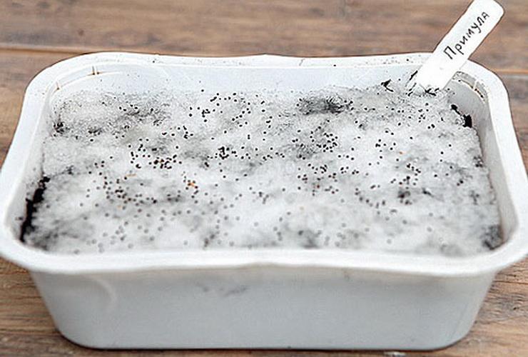 - При посеве семян примулы на рассаду можно использовать интересный прием: засыпать грунт снегом, а сверху разместить семена. Вода, образующаяся при таянии снега, поможет семенам углубиться в почву.