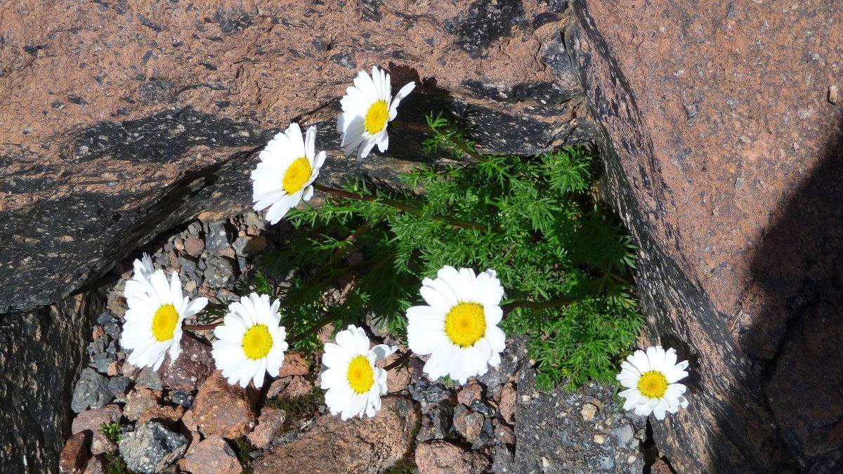 - Цветки образуют одиночные крупные соцветия-корзинки, диаметром от 25 до 60 мм. Краевые цветки белого цвета и длинные, семена не образуют. Центральные цветки трубчатые, окрашены в желтый цвет и производят плоды-семянки.