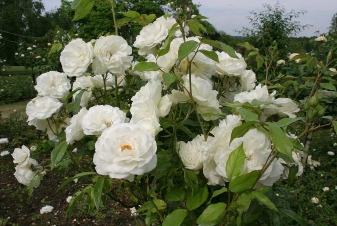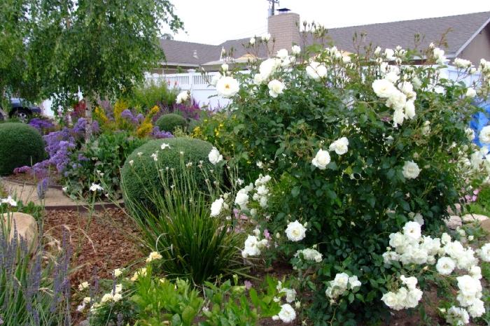 В последнее время белые монохромные сады становятся все более популярными. Плетистая роза Айсберг может стать отличной основой для таких посадок.