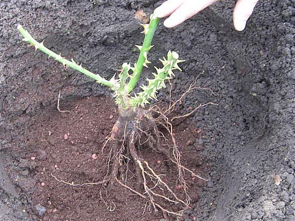 - Постепенно засыпайте штамб розы землей, равномерно утрамбовывая грунт вокруг.