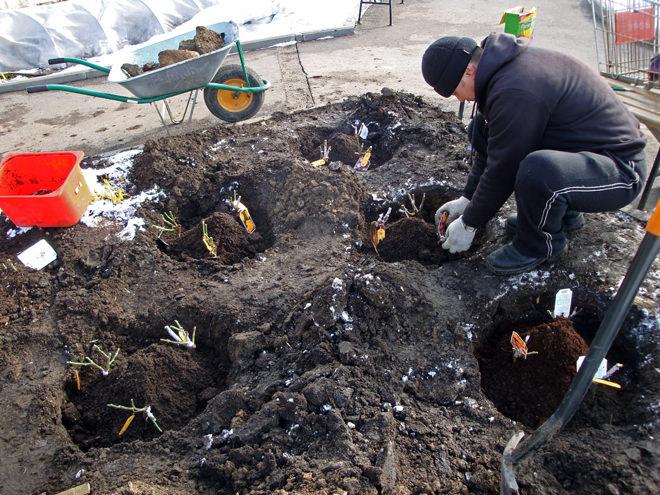 - На дно ямки укладываются компост или перегной, а затем засыпается землёй.