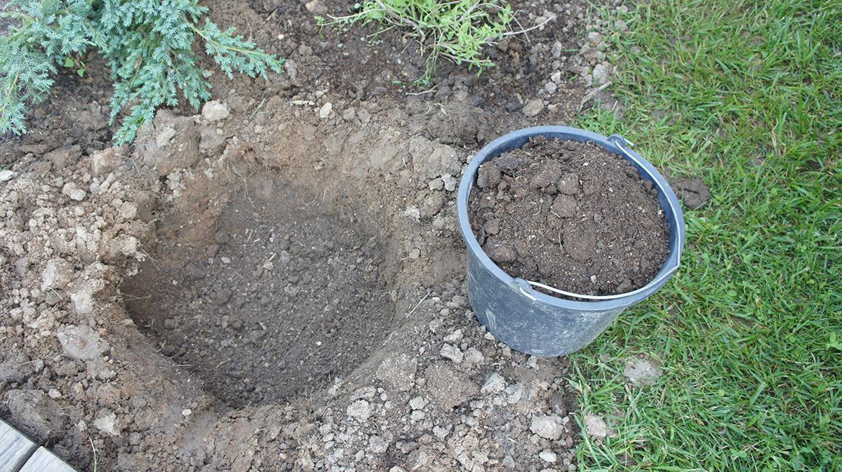 - Заполняя ямку землёй, нужно добавлять её постепенно и уплотнять, а после завершения заполнения почву следует утрамбовать.
