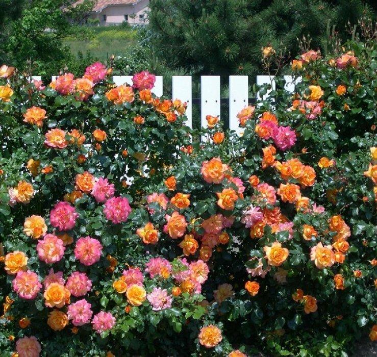 Роза шраб Сахара радует глаз своими красными и оранжевыми цветами, становясь настоящим украшением вашего сада в период цветения.