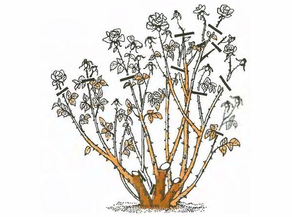 Каждый цветовод самостоятельно выбирает, когда ему удобнее проводить основательную обрезку кустов – осенью или весной. В любом случае одна из обрезок должна носить профилактический характер. Это необходимо для удаления поврежденных побегов или ветвей, которые мешают развитию растения. Основная обрезка заключается в укорачивании всех веточек до 3-4 почек. Длина оставшихся веток после обрезки должна составлять более 10 см. В течение сезона цветения рекомендуется удалять увядшие бутоны вместе с верхушками.