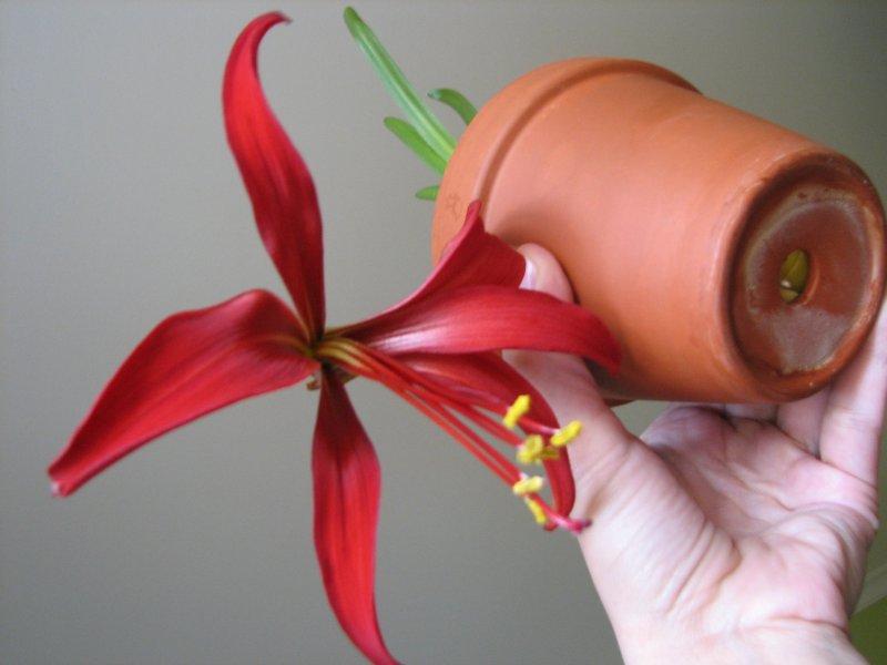 Во время цветения образуется гладкий, полый внутри, красно-буроватый стебель, который увенчан крупным несимметричным цветком. Шесть удлиненных лепестков изящно закручиваются, создавая привлекательную форму.