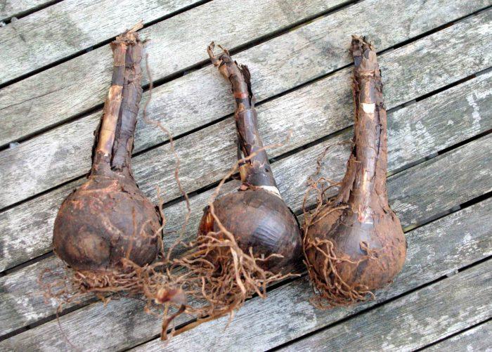 Полное увядание листьев является сигналом для выкопки и очистки луковиц от земли и высохшей ботвы. Не рекомендуется обрезать корни луковиц.