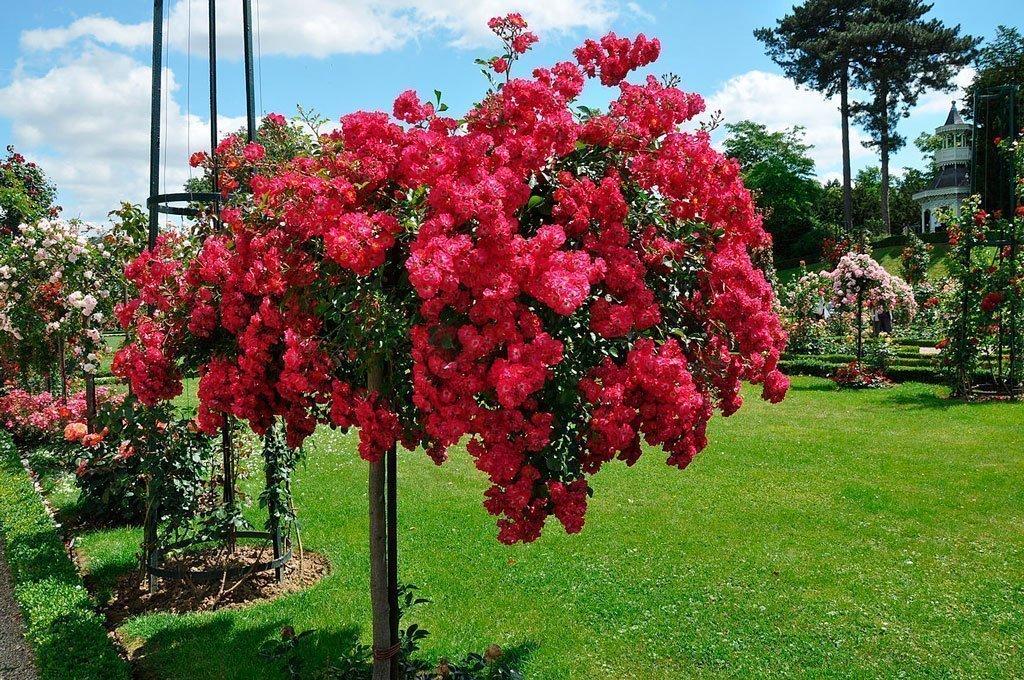 - Плакучая (каскадная) форма — высота штамба составляет 1,2-1,7 м, используются плетистые и почвопокровные розы.