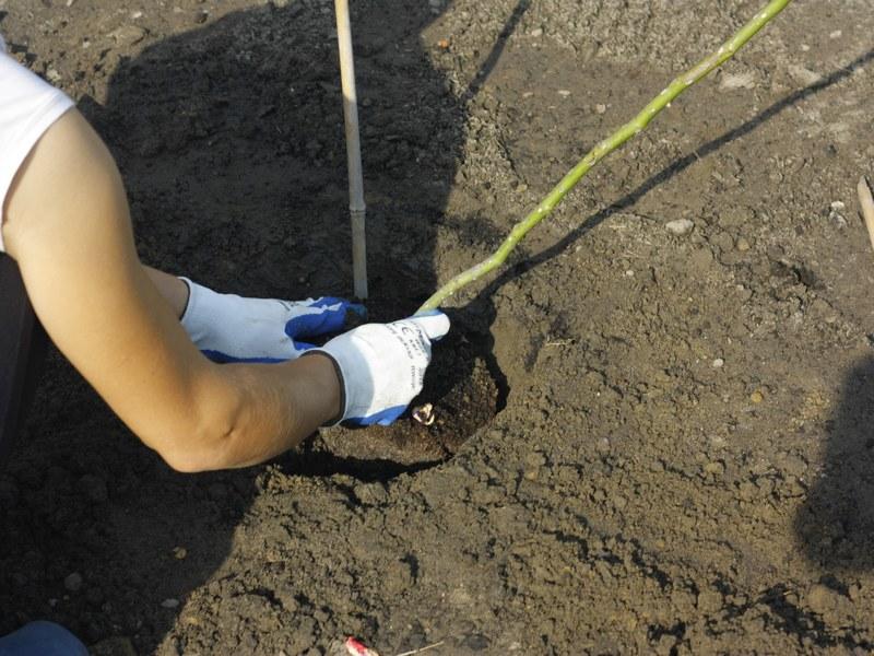 - Поместите черенок в подготовленную яму, аккуратно расправляя корни. Стволик растения должен быть наклонен под углом 45° в сторону прикорневого изгиба. Убедитесь, что корневая шейка находится на 2-3 см ниже уровня почвы.
