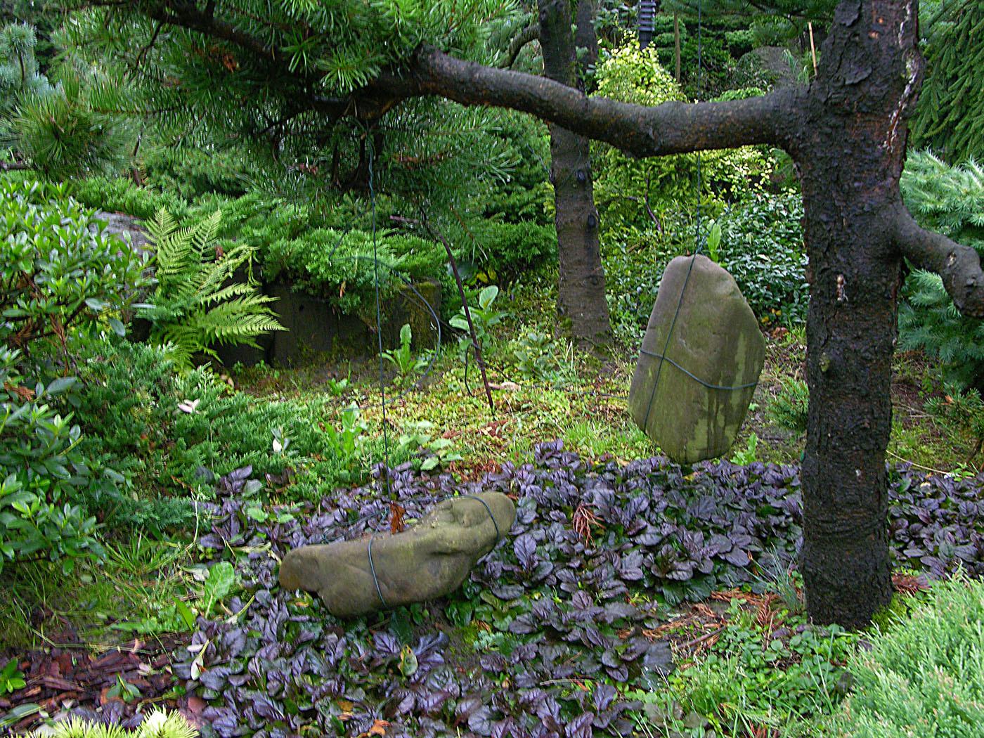 Однако проволока может оказаться недостаточно надежной для хвойных ветвей. В таких случаях рекомендуется дополнительно подвешивать камни на ветки. Это обеспечит надежное удержание мощных ветвей в заданном положении. Сосны, как правило, хорошо поддаются сгибанию.