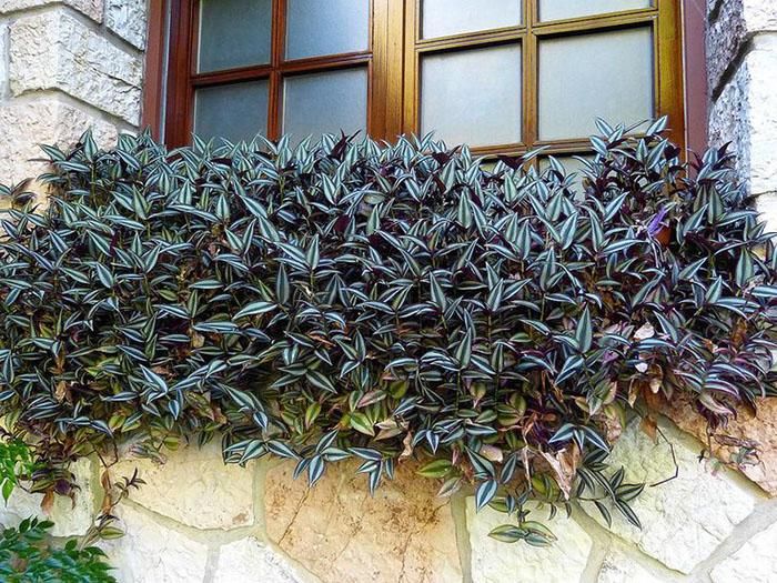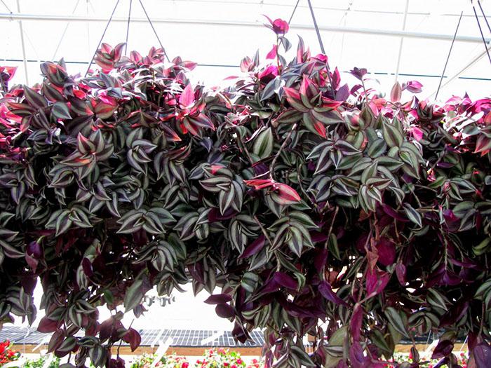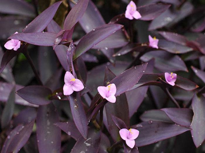 - Традесканция фиолетовая (сеткреазия) – это растение с полегающими ползучими стеблями и продолговатыми, заостренными листьями зелено-фиолетового цвета. Обратная сторона листа имеет более насыщенный фиолетовый окрас. Листья опушены. Розовые цветки ярко контрастируют с темной листвой. Данный вид требует хорошего освещения, иначе побеги вытягиваются, а окраска тускнеет.