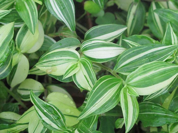 Традесканция белоцветковая (белая) прекрасно чувствует себя даже в самых затененных помещениях. У этого вида длинные травянистые побеги с поочередно расположенными мелкими листьями. Листовые пластины овальные, с заостренной верхушкой, мягкие и блестящие. Существуют сорта с ярко-зелеными, бело-зелеными и трехцветными листьями. Цветет довольно редко, образуя мелкие белые цветки. Чаще всего используется как ампельное растение.