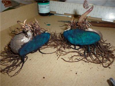 Перед началом размножения цветочного клубня его необходимо предварительно просушить. При разделении важно учитывать, чтобы на каждой части корешка оставались почки и листья. Места срезов рекомендуется обработать зеленкой или посыпать активированным углем, после чего следует дать им подсохнуть в течение двух дней.