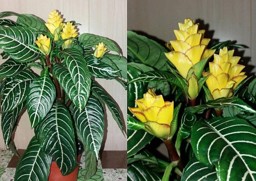 Цветы небольшие, а прицветник выделяется своей уникальной пирамидальной формой, достигающей 10-15 см в высоту, и яркими оттенками желтого, красного или оранжевого.