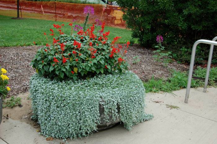 Дихондра ампельная прекрасно подчеркивает красоту рядом растущих цветущих растений, таких как: