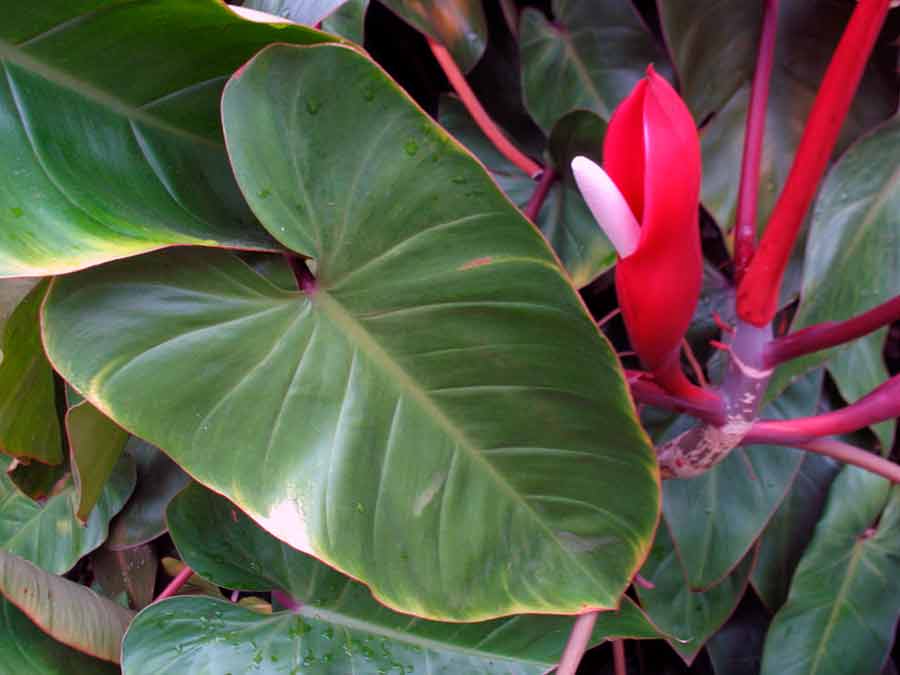Это разновидность краснеющего филодендрона. Листья имеют плотную текстуру и желтоватый оттенок, который создает яркий контраст с красными стеблями и прожилками на листьях.