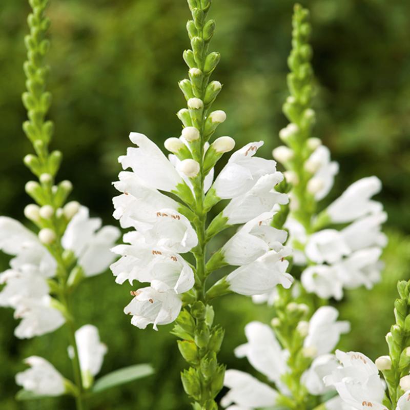 - Физостегия Crystal peak white. У этого сорта белоснежные соцветия, а высота куста составляет 40-45 см. Он легко размножается самосевом и семенами, цветет уже в первый год после посадки.