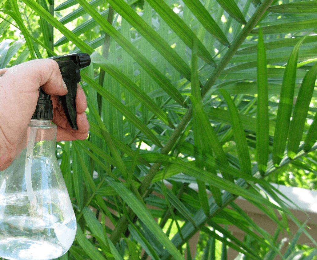 Пальма предпочитает повышенную влажность. Если листья начинают сохнуть и темнеть, необходимо принять меры. Опрыскивание листвы и воздуха из пульверизатора поможет решить эту проблему. Рекомендуется проводить эту процедуру каждое утро. После опрыскивания каждый лист следует аккуратно протереть салфеткой. Это позволит листьям дышать и избавит их от накопившейся пыли и грязи.