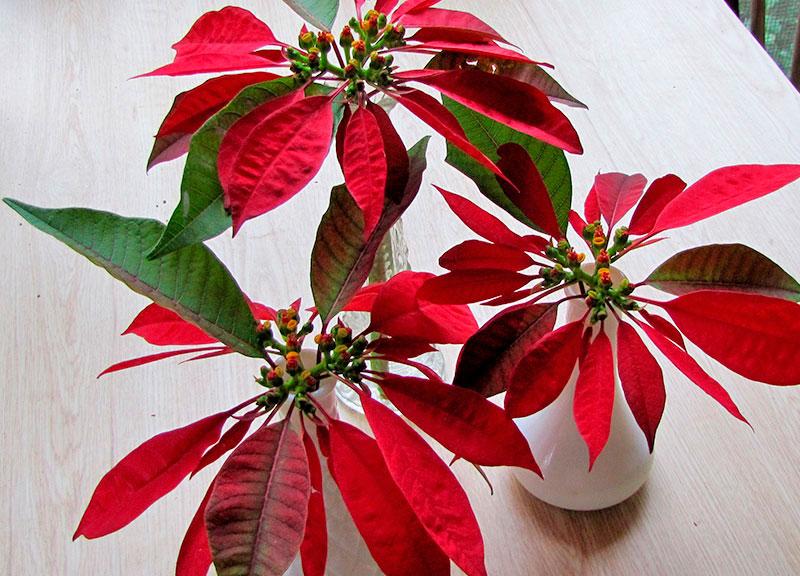 Второе название молочая красивейшего – пуансетия. Процесс образования бутонов начинается на 2-3 неделе декабря, и соцветия могут похвастаться яркими оттенками красного, розового и белого, хотя они выглядят менее эффектно на фоне насыщенной зеленой листвы.
