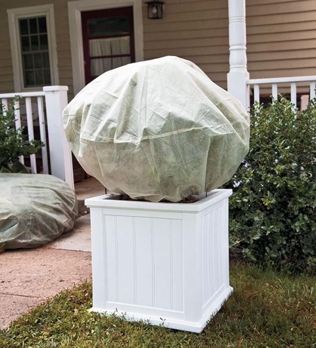 Чтобы помочь растениям пережить первую зиму, их следует укрыть лапником, а затем пленкой.